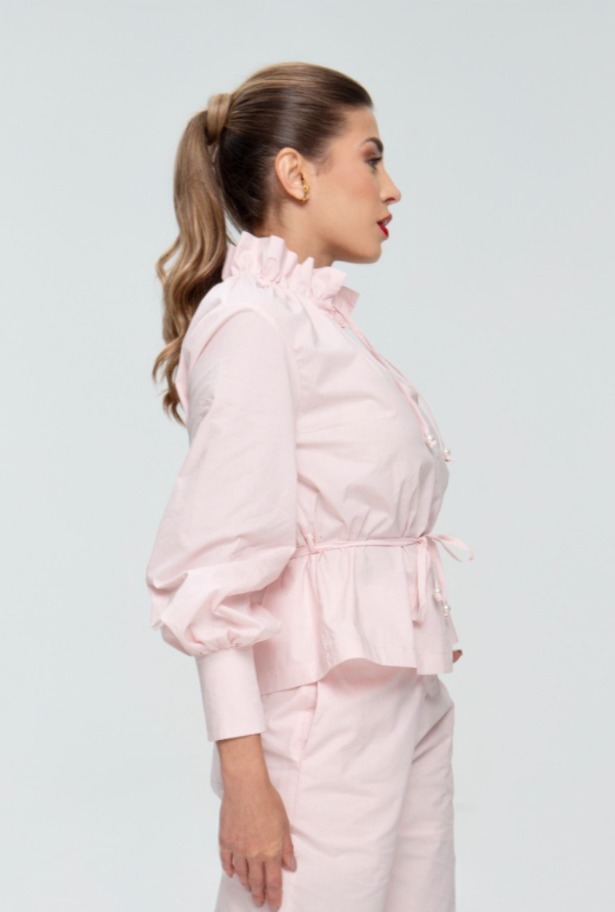 Essa blusa em tom rosa é confeccionada em tecido 100% algodão, com toque macio e caimento impecável. O diferencial está no decote franzido com amarração e ponteiras de pérola, que traz um ar romântico e moderno na medida certa.