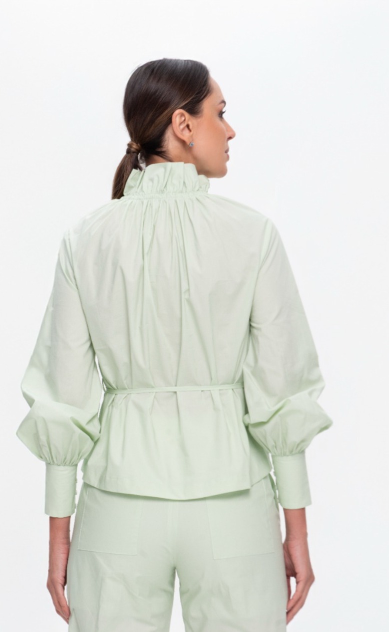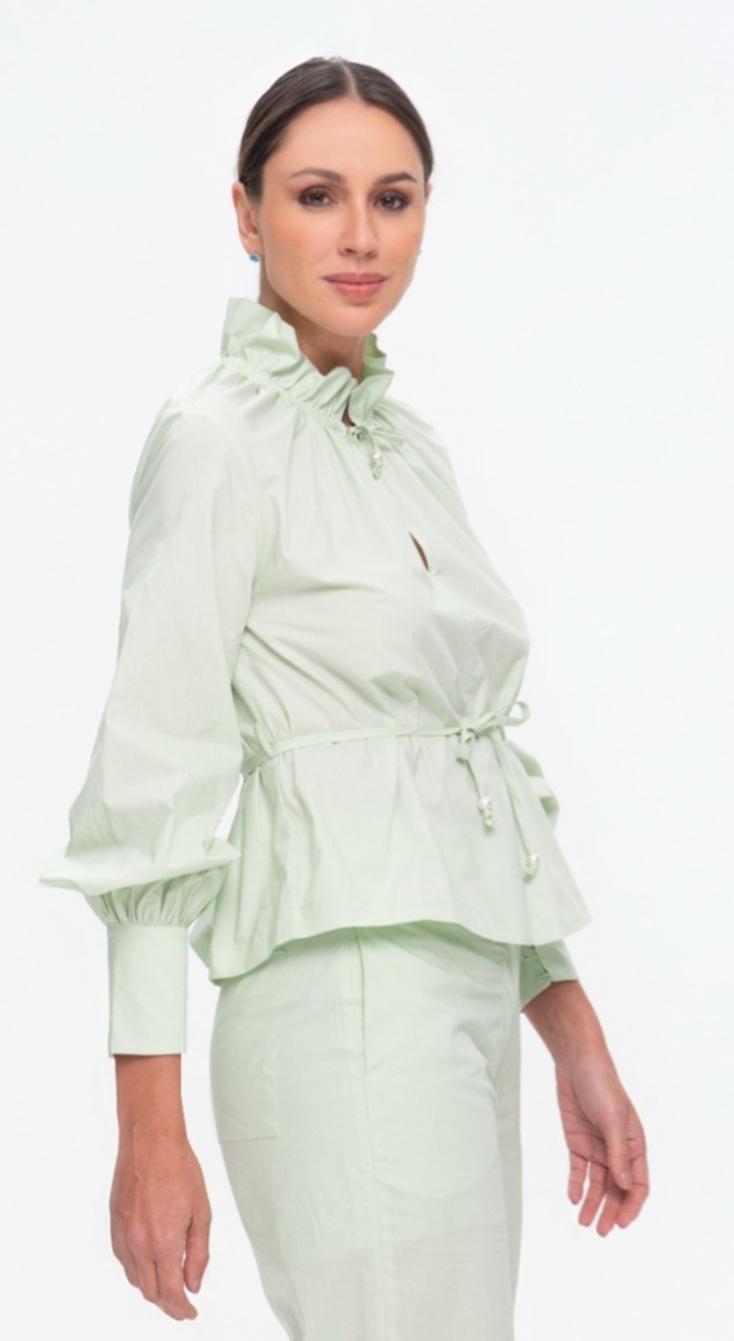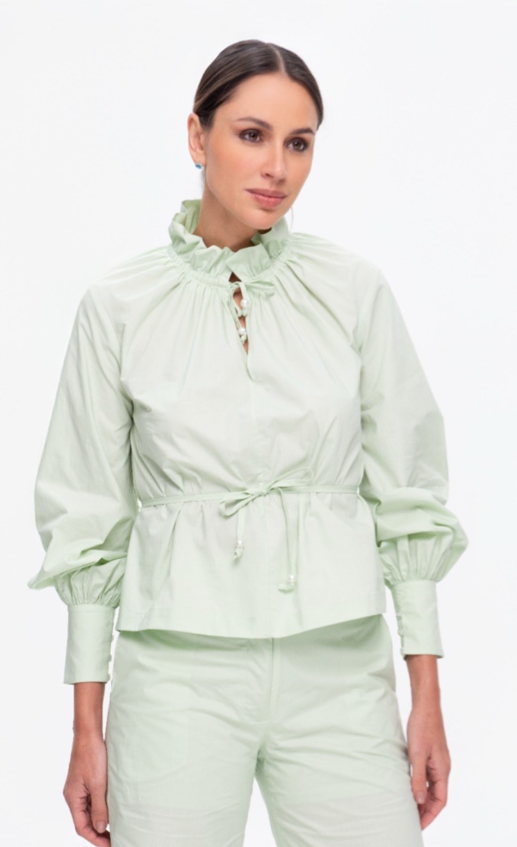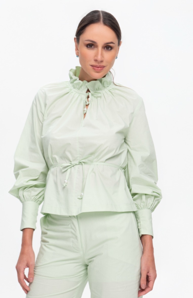 Essa blusa em tom verde menta é confeccionada em tecido 100% algodão, com toque macio e caimento impecável. O diferencial está no decote franzido com amarração e ponteiras de pérola, que traz um ar romântico e moderno na medida certa.