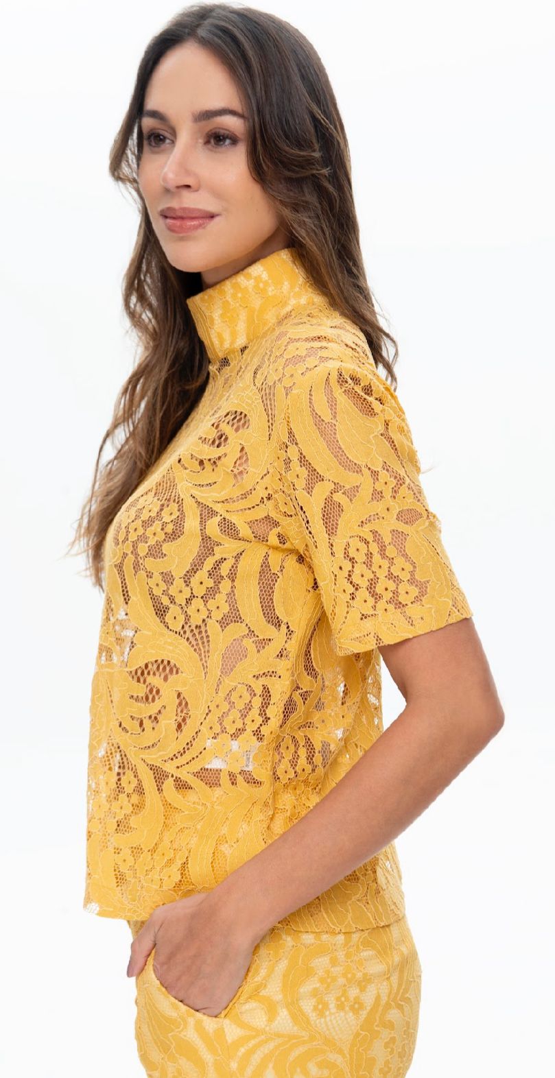 Delicada e cheia de charme, essa blusa é feita inteiramente em renda, com acabamento refinado e caimento leve. A gola mais alta traz um toque elegante e clássico, enquanto as mangas curtas equilibram com frescor e modernidade.