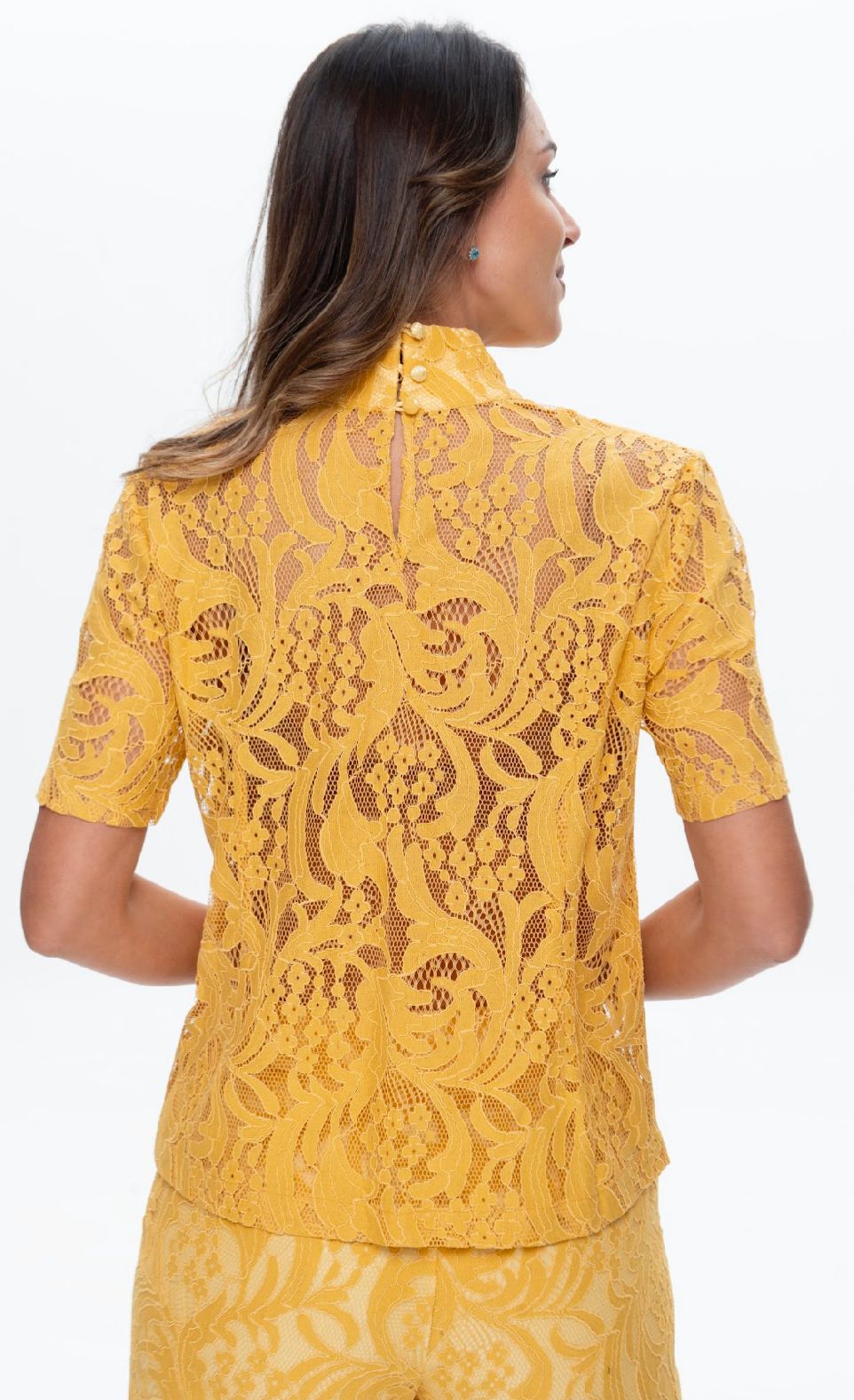 Toda em renda com textura delicada e visual sofisticado.Gola mais alta que valoriza o colo com elegância,mangas curtas para leveza e conforto,ideal para looks mais refinados, do casual chic ao office look