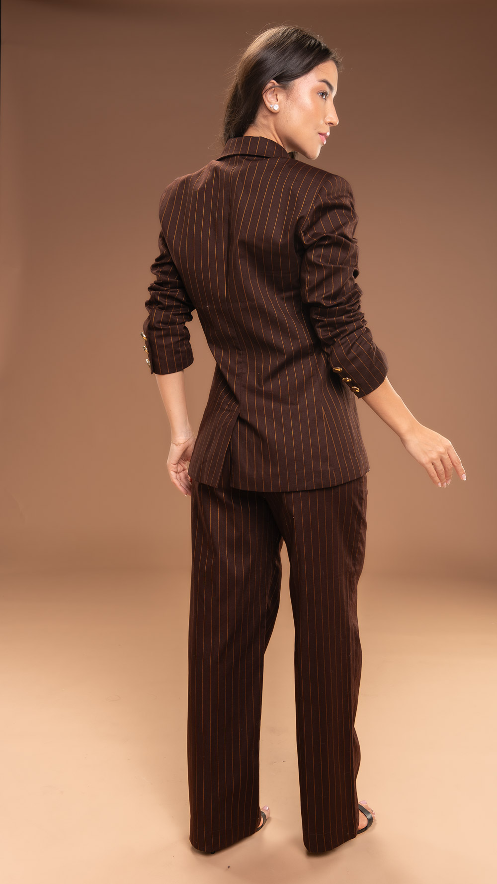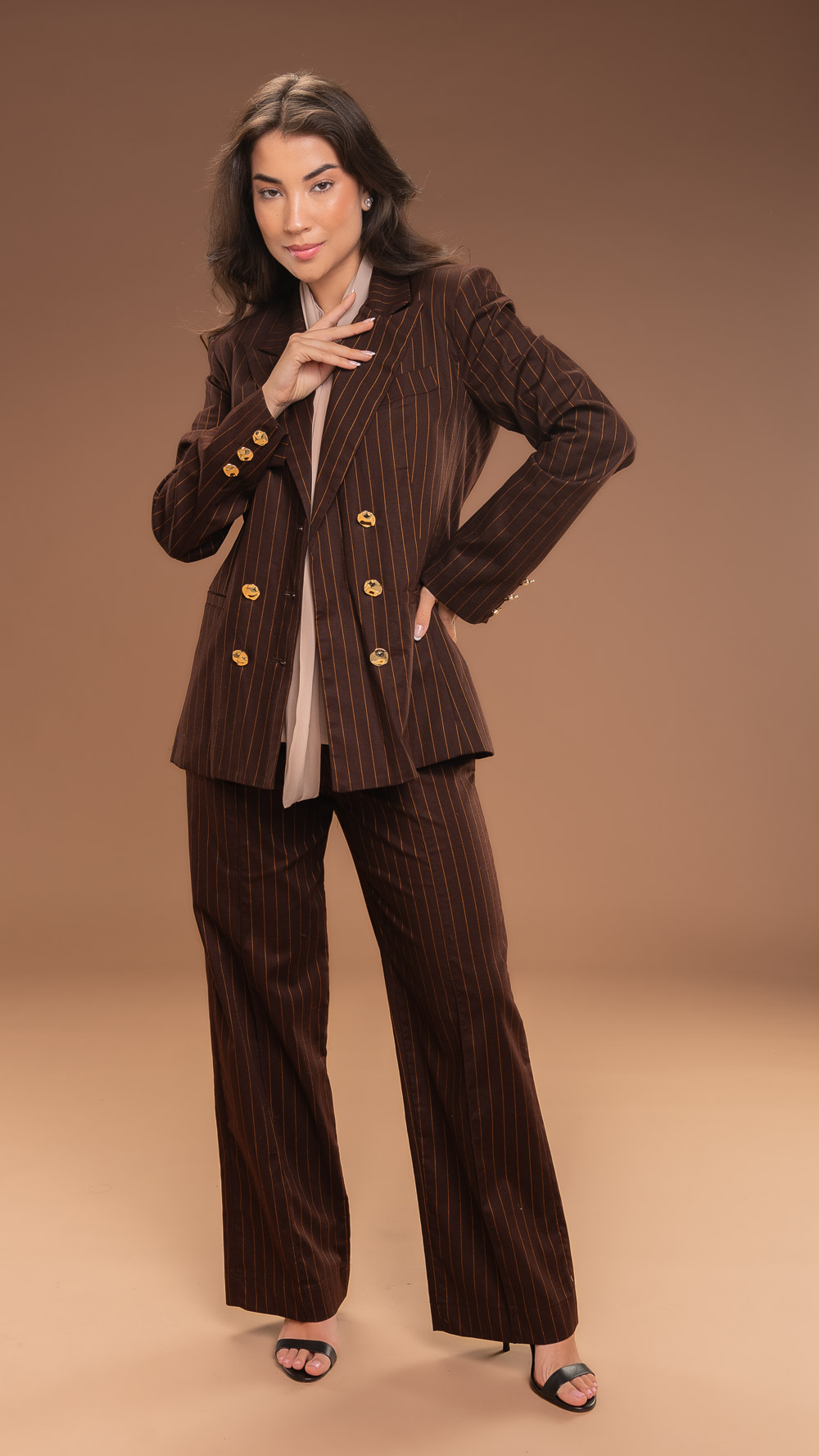 Essa calça alfaiataria em risca de giz na cor café combina tradição e modernidade. Com um toque sofisticado e linhas verticais que alongam, essa peça oferece elegância e personalidade.