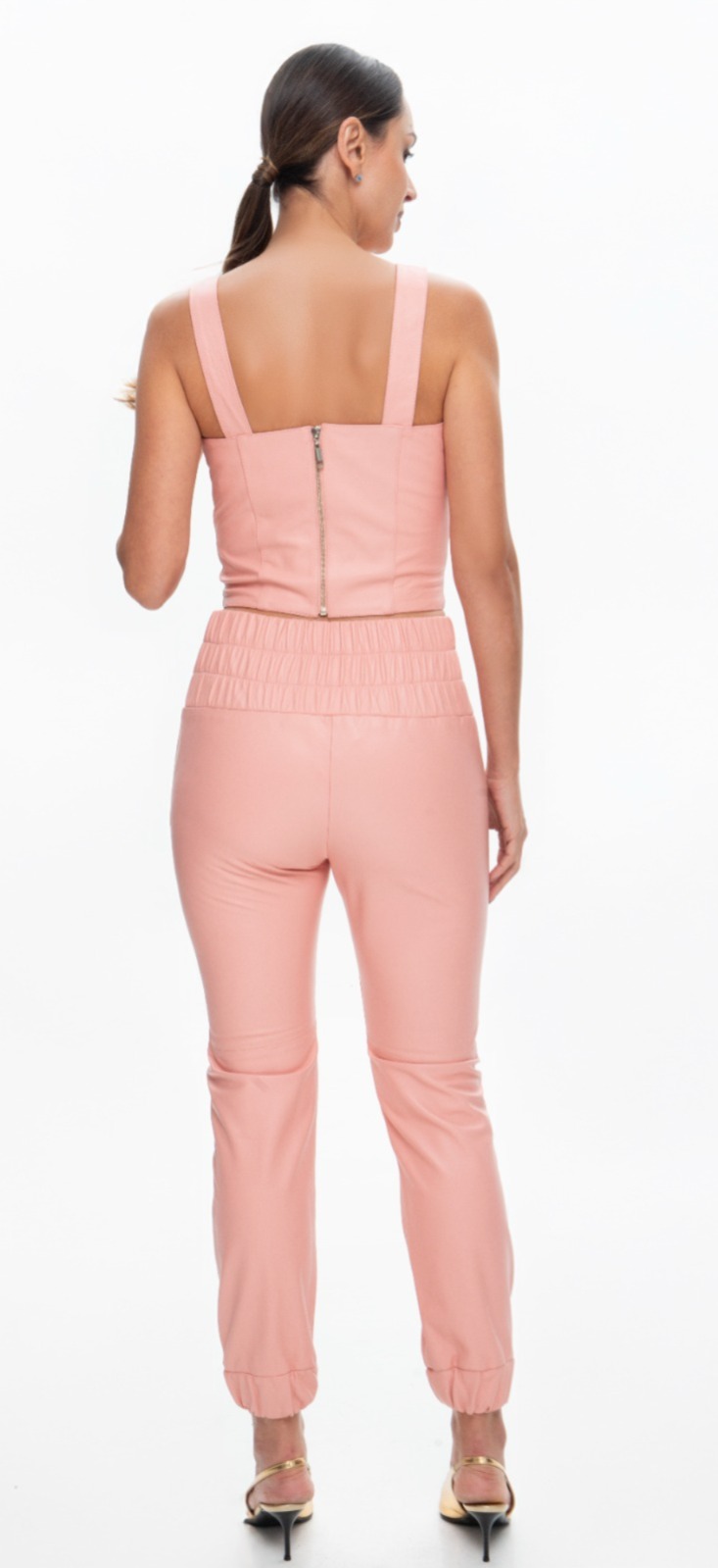 CALÇA COURO CÓS LARGO ROSA PASTEL