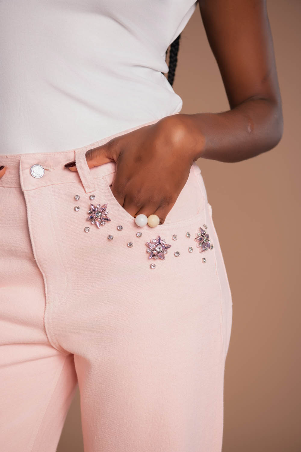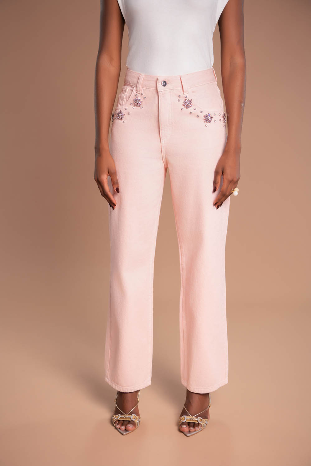 Feita em algodão de alta qualidade na cor rosa, oferece conforto e caimento impecável. Os bordados exclusivos adicionam um toque artesanal e elegante, tornando essa calça uma escolha versátil para compor looks casuais ou mais elaborados.
