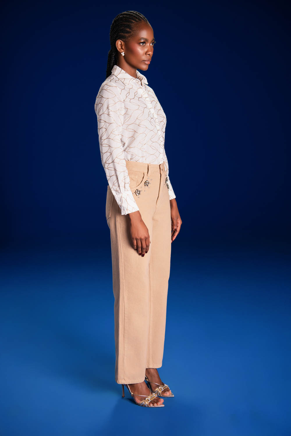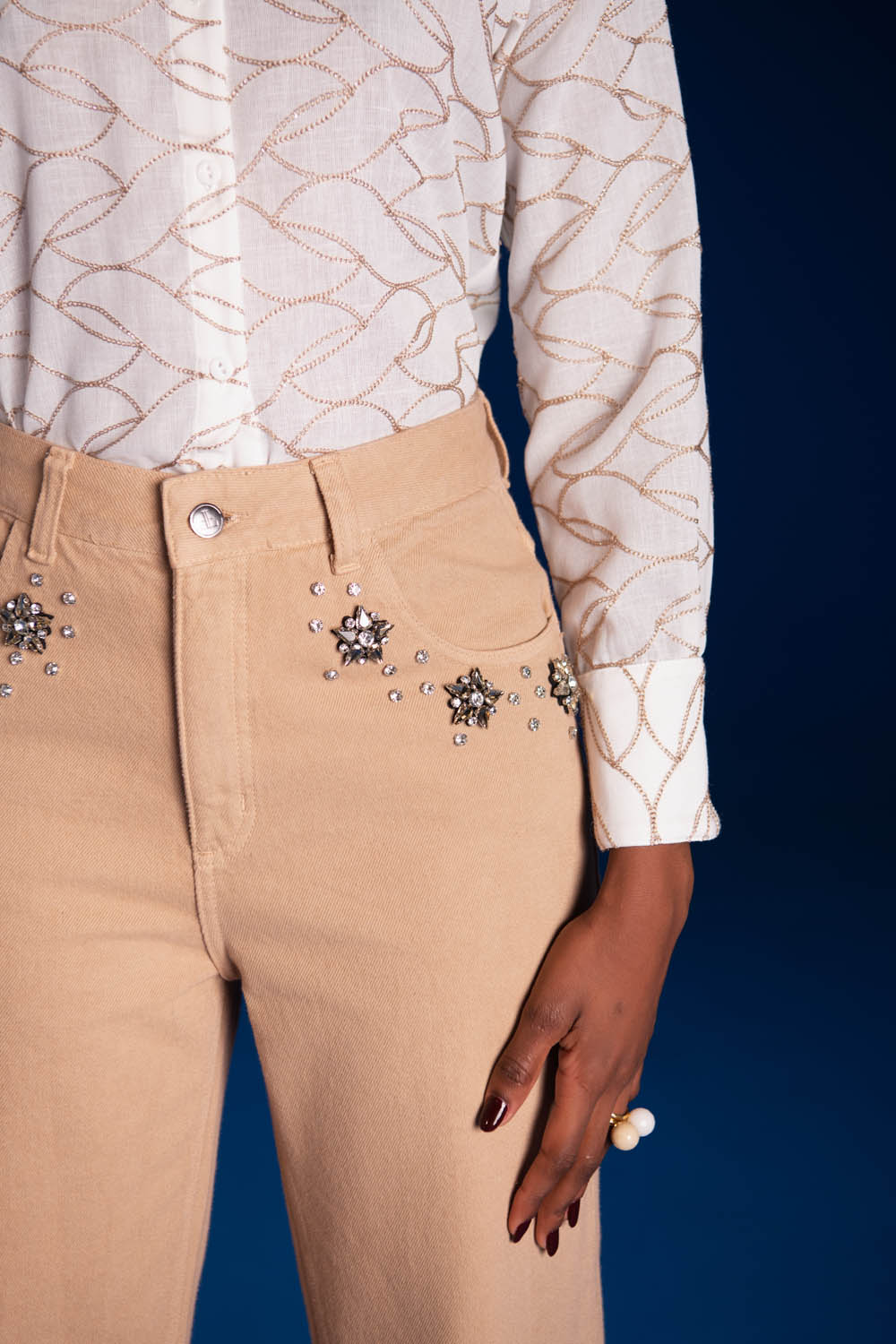 Feita em algodão de alta qualidade na cor trigo, oferece conforto e caimento impecável. Os bordados exclusivos adicionam um toque artesanal e elegante, tornando essa calça uma escolha versátil para compor looks casuais ou mais elaborados.