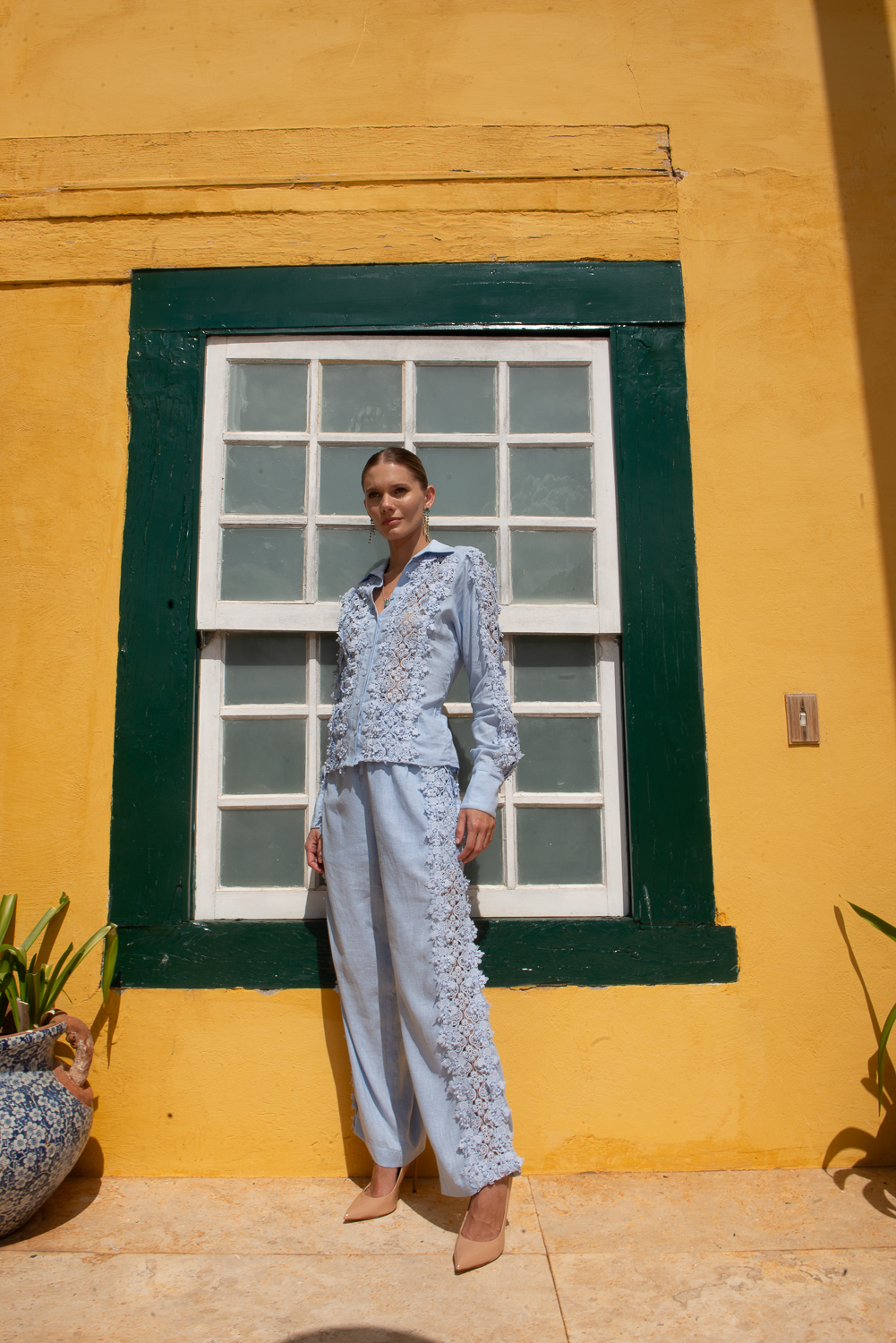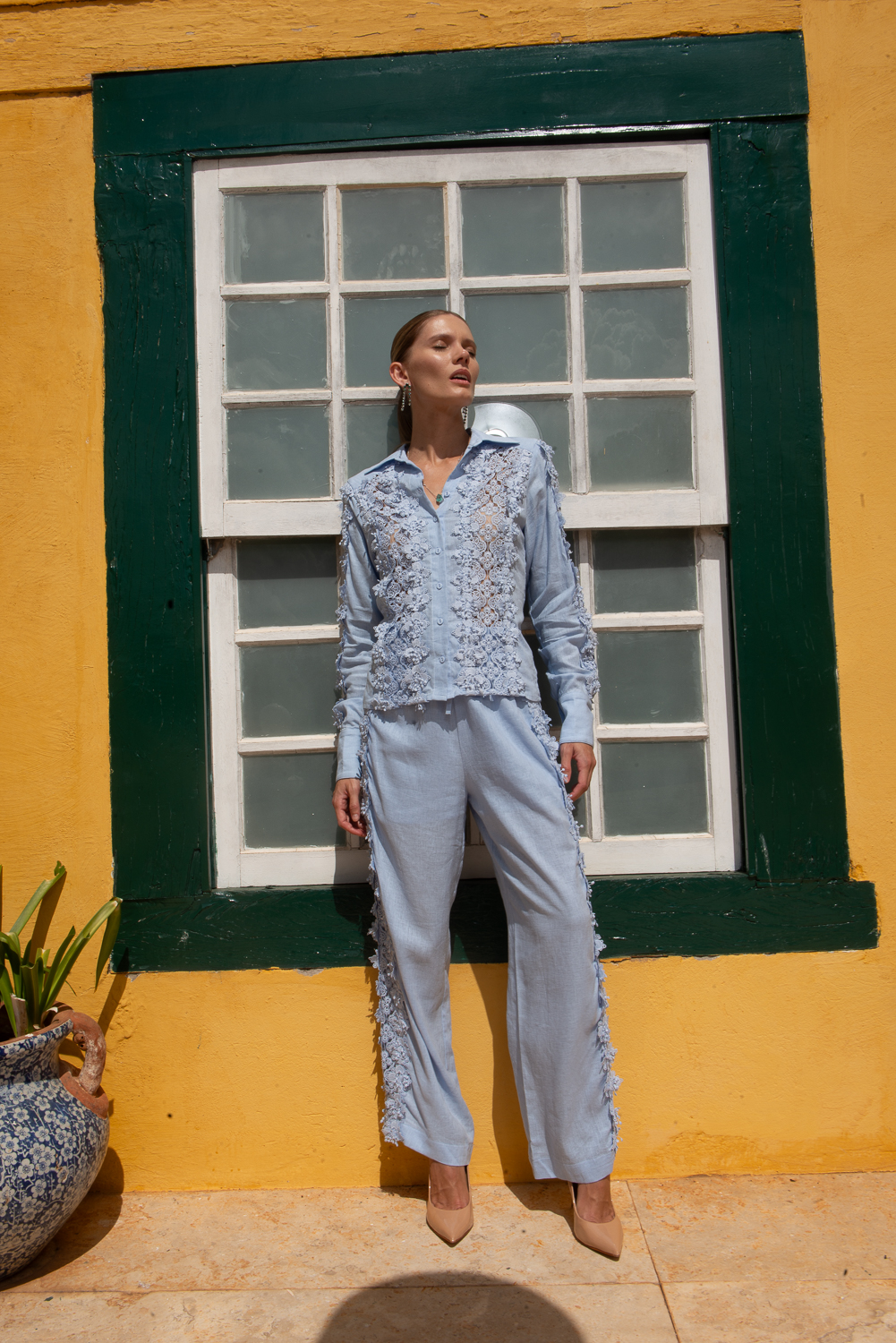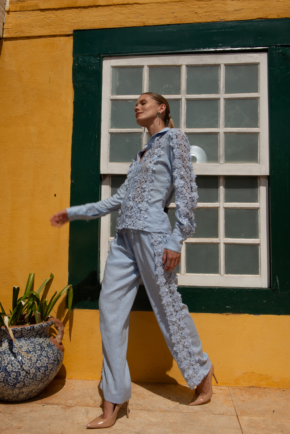 Essa calça une o frescor do linho com detalhes em guípir, com a maciez da viscose, resultando em um tecido confortável e com ótimo caimento.