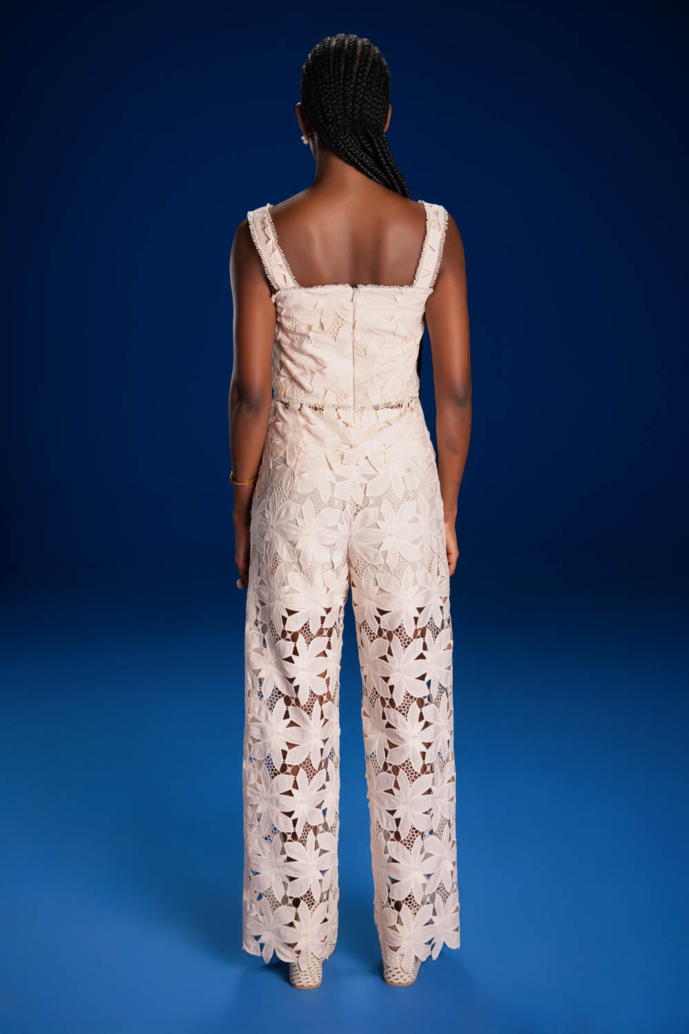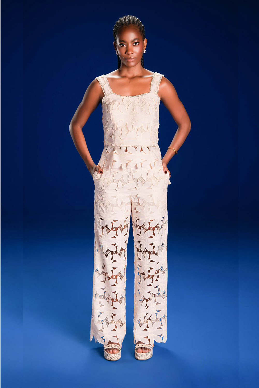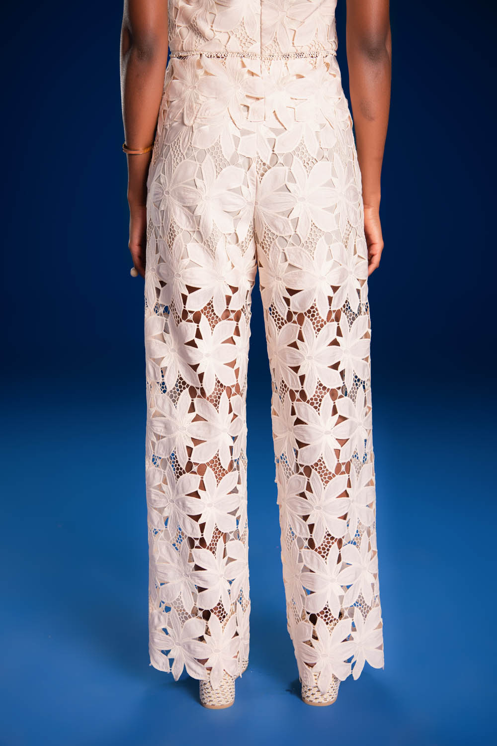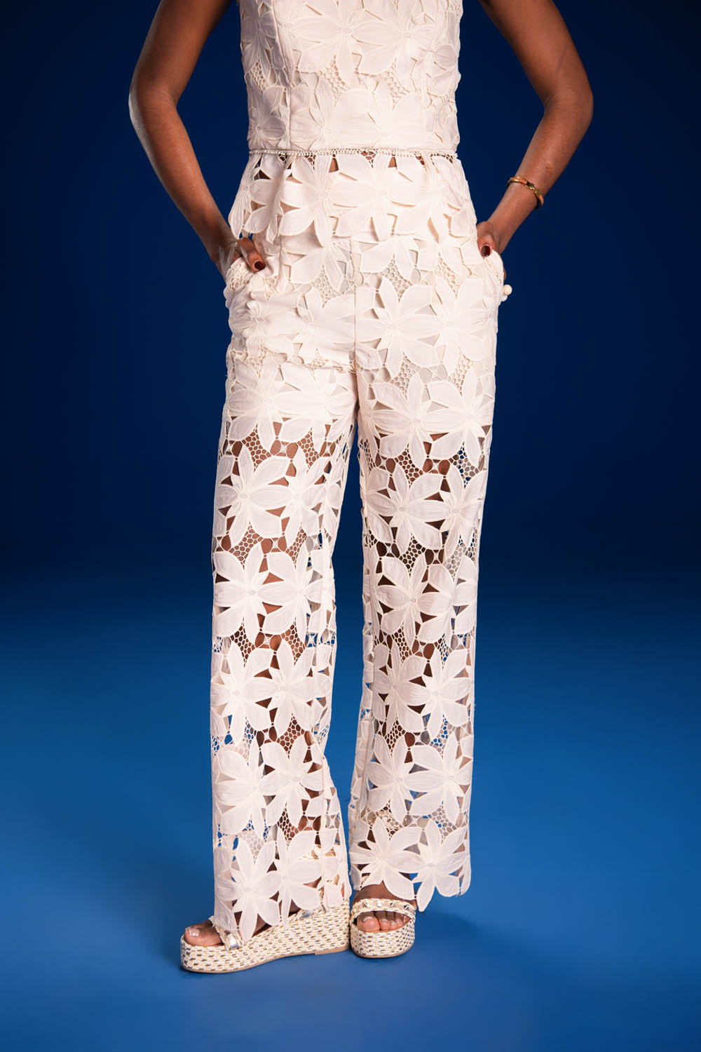 Com recortes a laser formando uma delicada renda, ele é enriquecido pela aplicação de aviamentos que destacam ainda mais sua exclusividade. A calça possui um detalhe transparente, perfeito para um toque leve e fresco no verão, enquanto a blusa apresenta modelagem basque, conferindo uma silhueta estruturada e feminina.