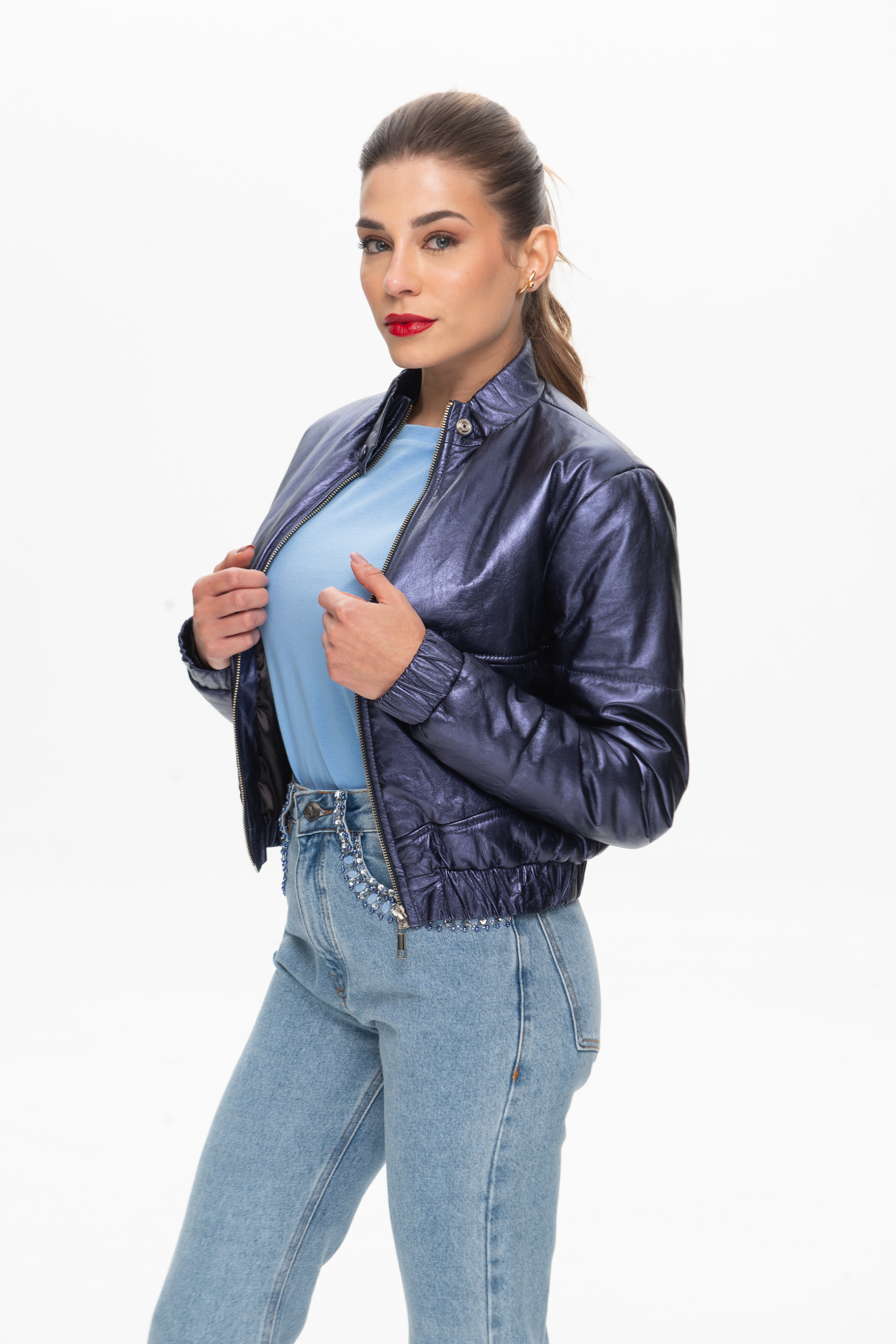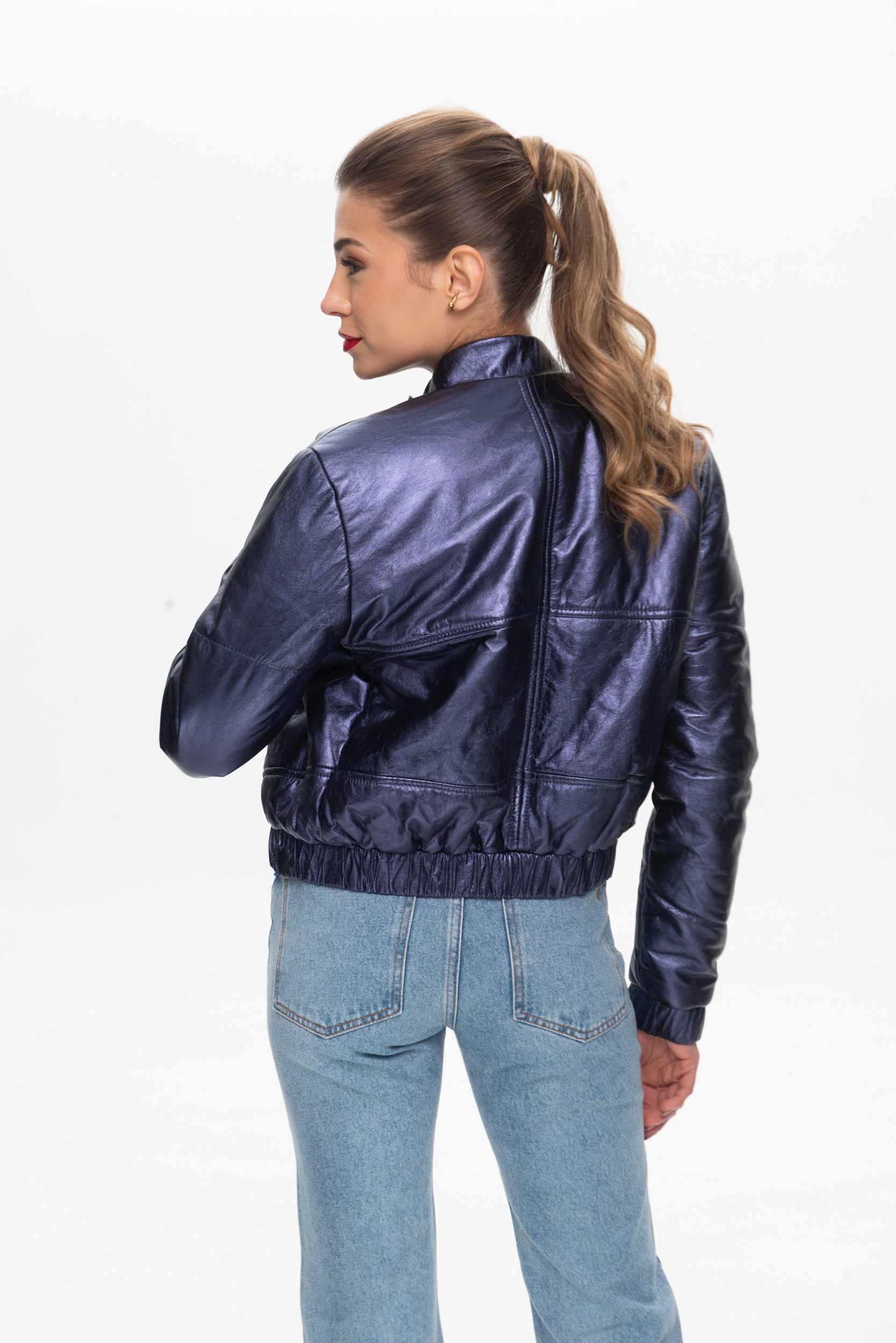 JAQUETA COURO AUREA METALIZADA BOMBER MARINHO