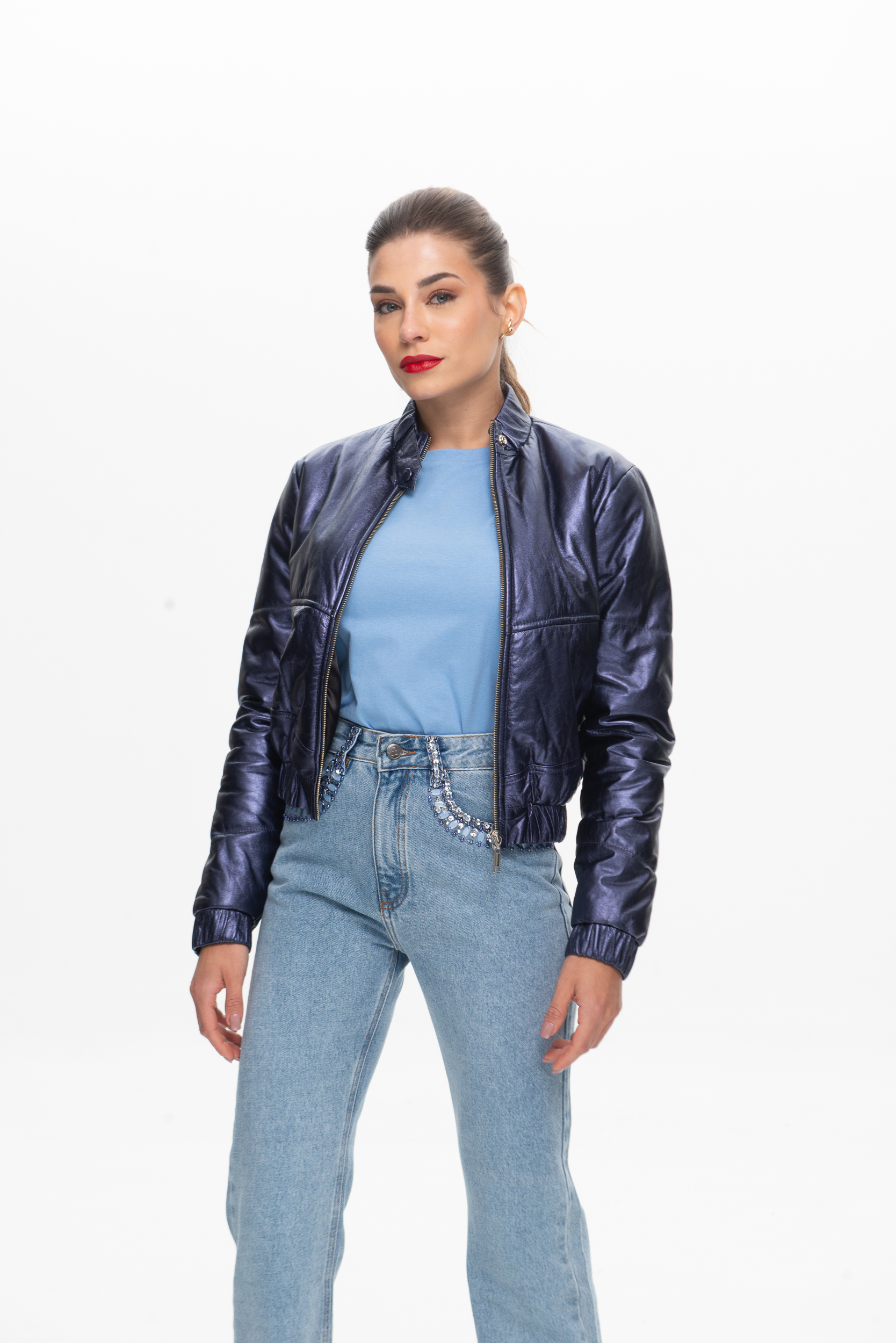 Essa jaqueta bomber em couro legítimo é a escolha ideal para quem busca estilo e conforto térmico em uma só peça. Confeccionada em couro legítimo de alta qualidade, com brilho sutil que valoriza ainda mais o tom azul profundo. Modelagem bomber, moderna e versátil, com punhos e barra ajustados para um caimento impecável. Forrada com manta térmica, perfeita para os dias frios, mantendo o corpo aquecido sem abrir mão da elegância, fechamento com zíper frontal e gola alta com botão de pressão que protege do vento com muito estilo. alças de couro ou jeans para um visual urbano e fashion. Saias midi e botas para um look moderno e sofisticado. Sobreposição com vestidos para uma produção invernal com atitude.