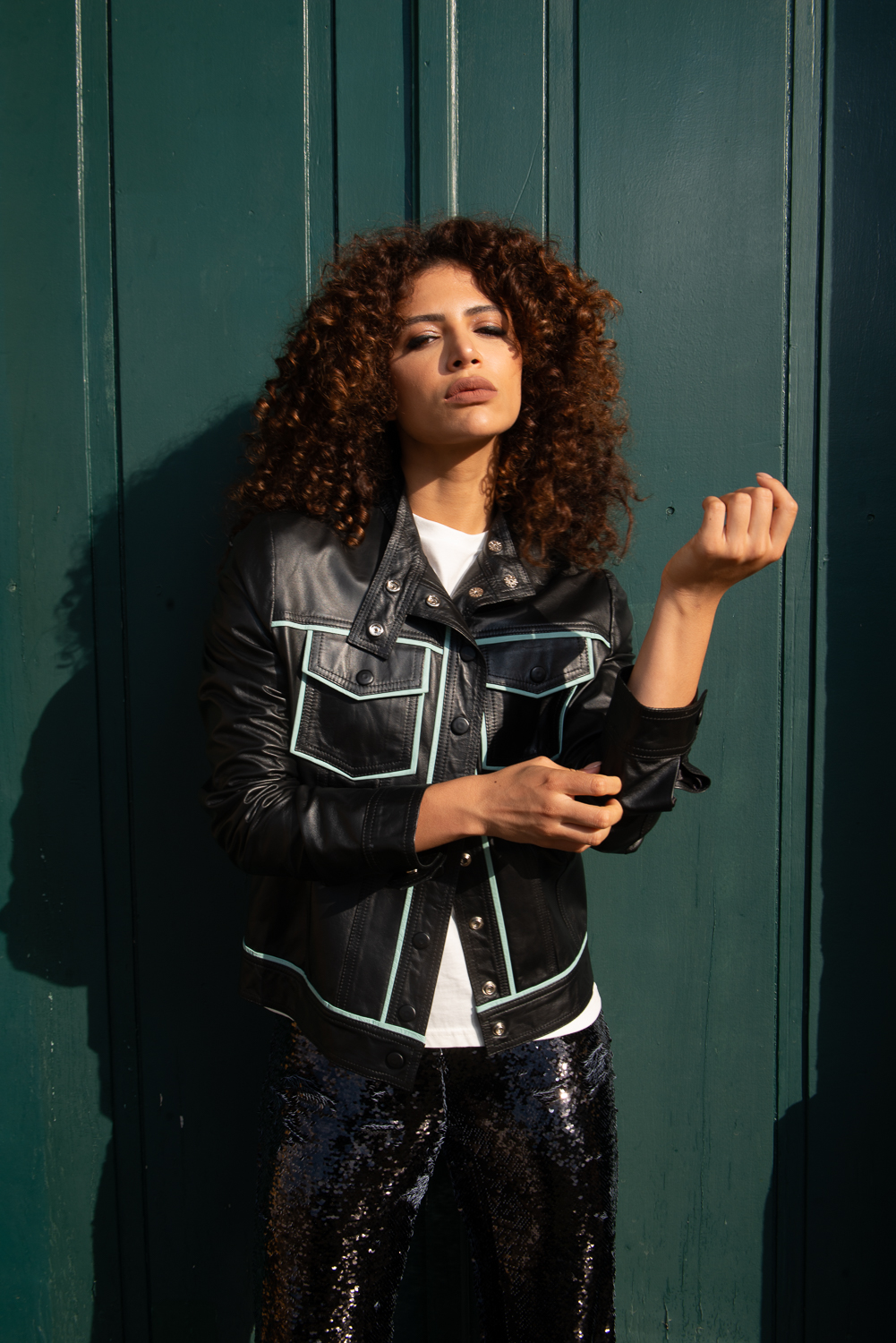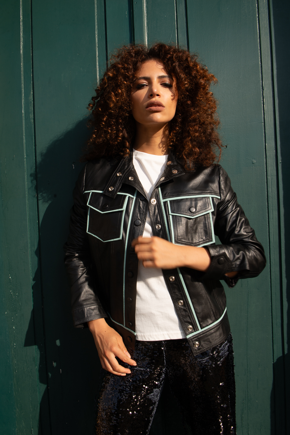 JAQUETA COURO JADE GOLA PADRE PRET/ TURQUESA