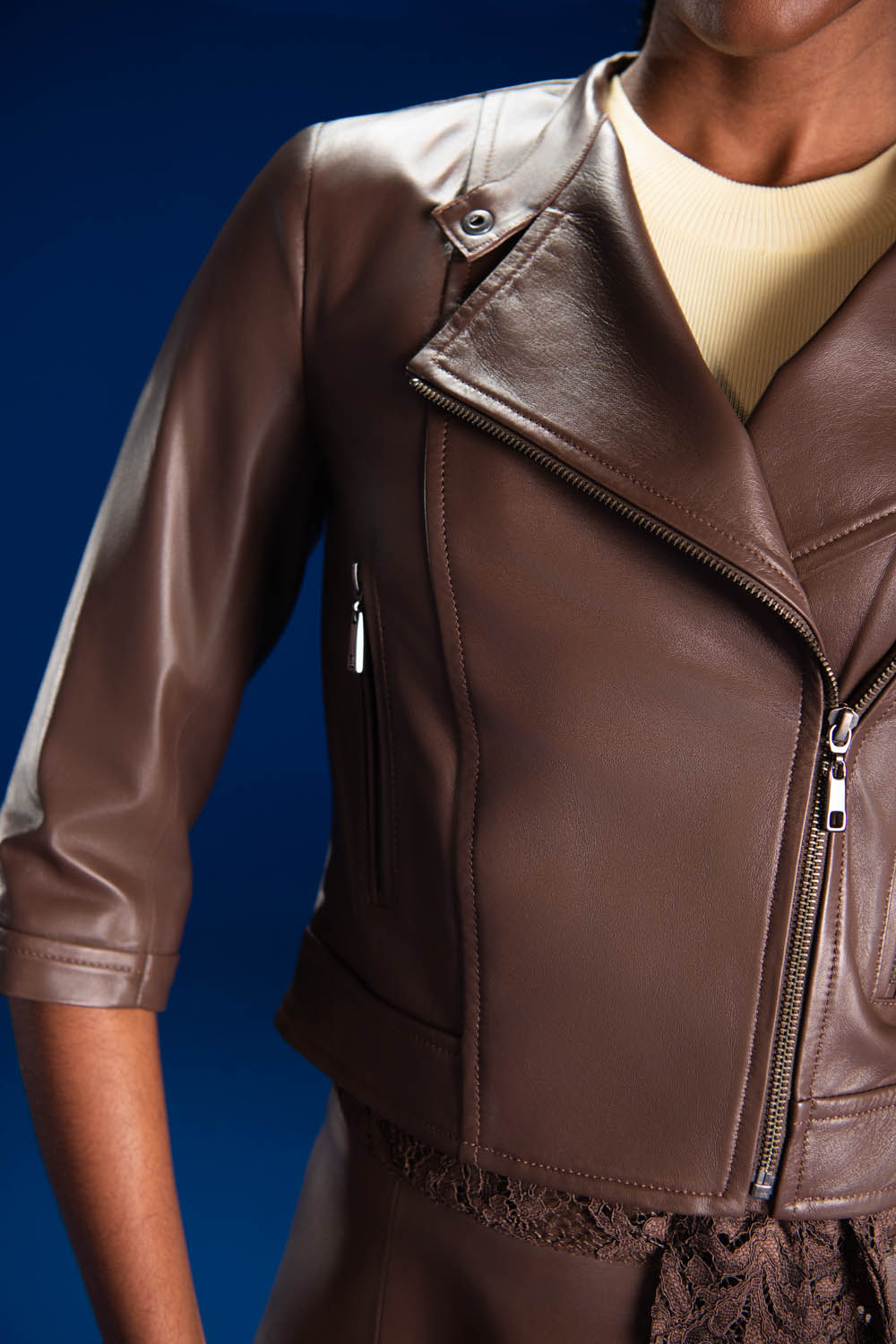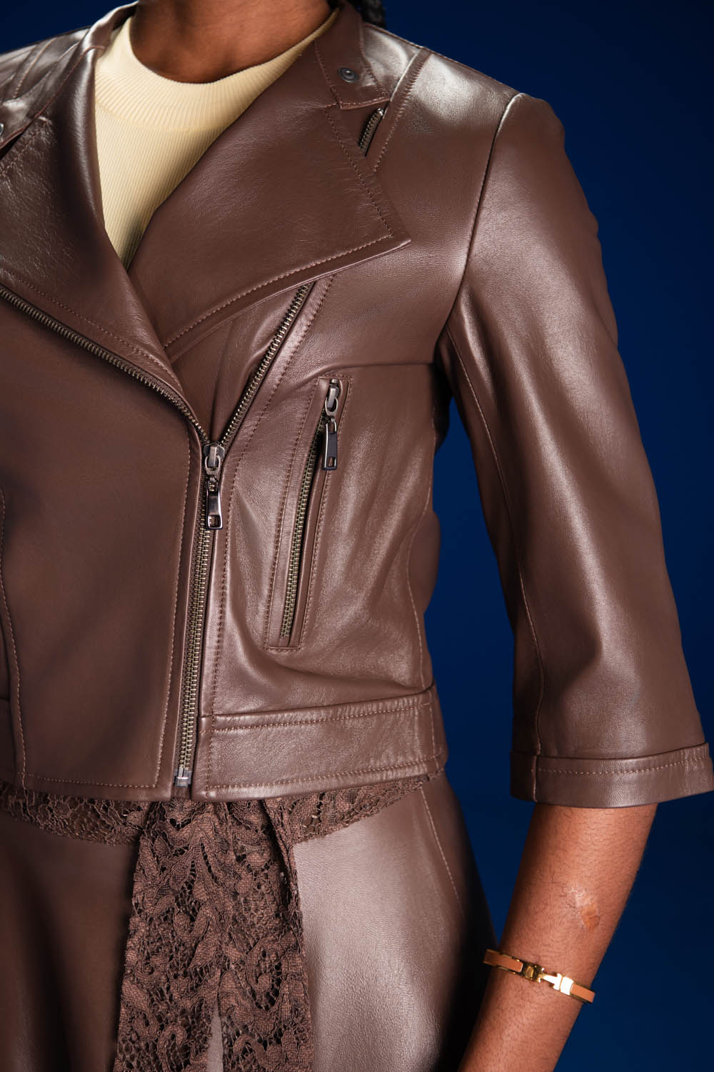 A jaqueta em couro com manga 3/4 combina o estilo clássico do couro com um toque contemporâneo, criando um visual sofisticado e despojado ao mesmo tempo.