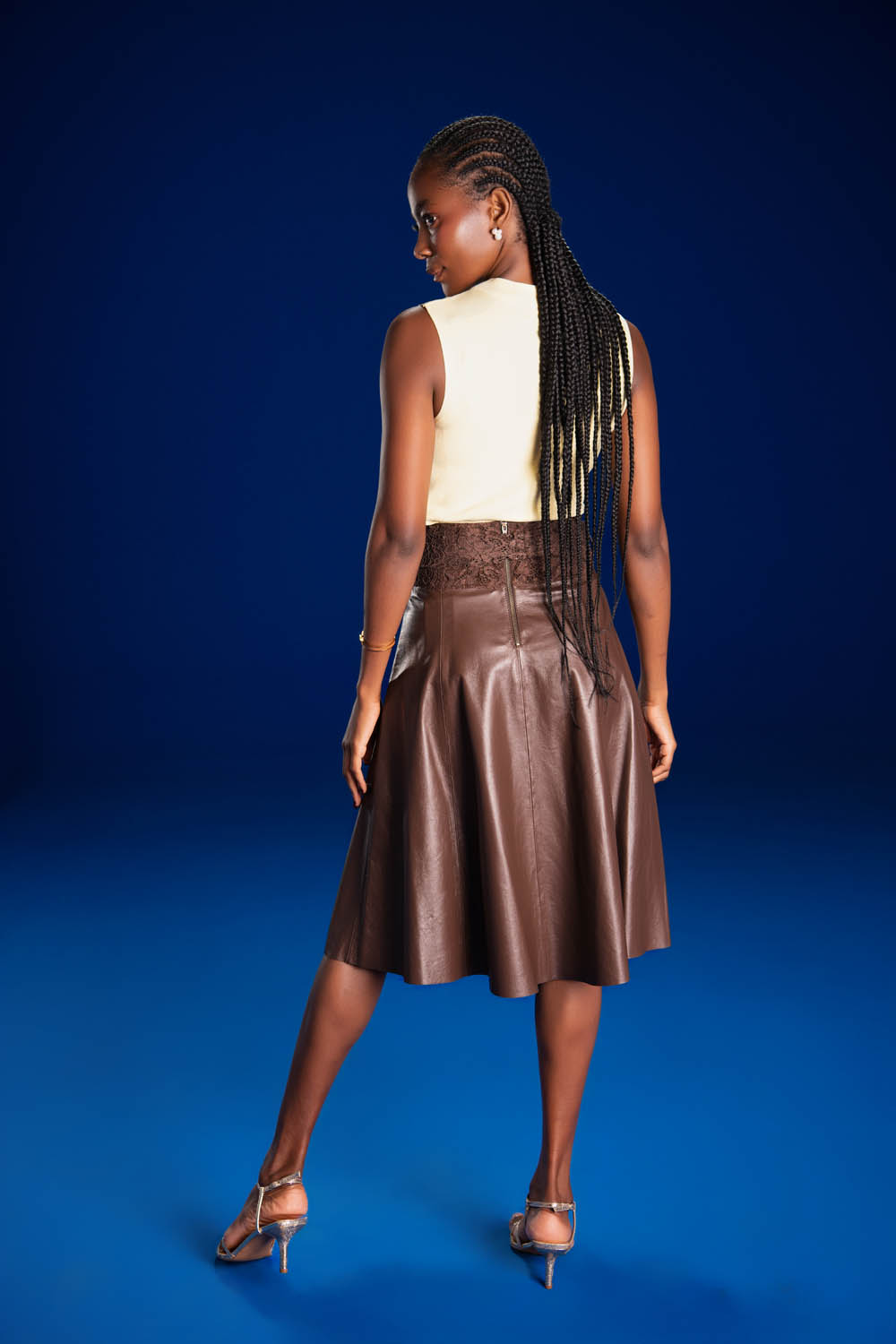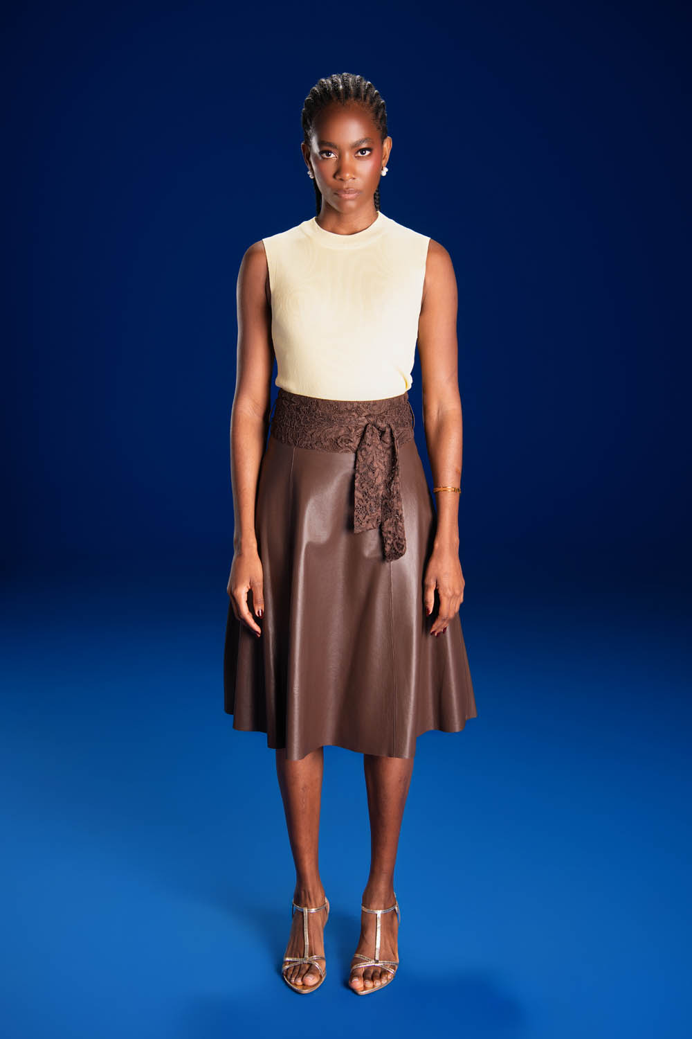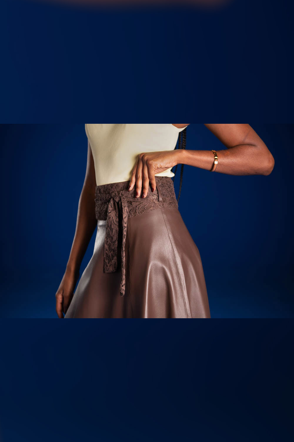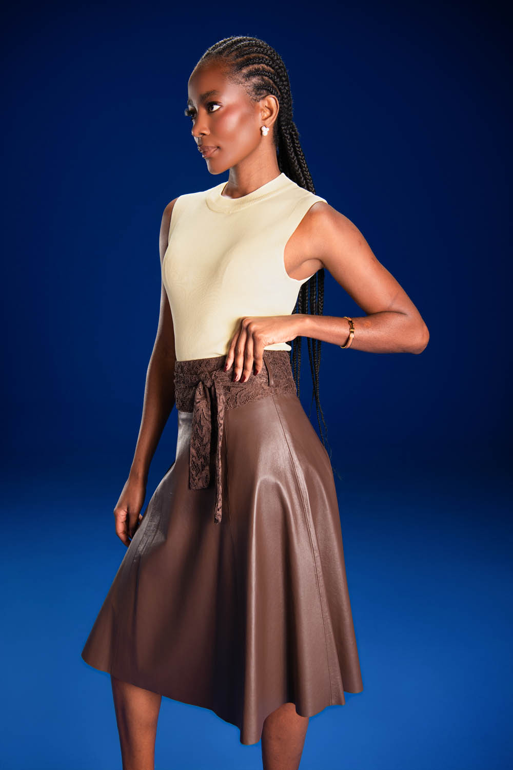 Saia em pelica 100% couro com aplicação de renda, unindo a sofisticação do couro à delicadeza da renda.
