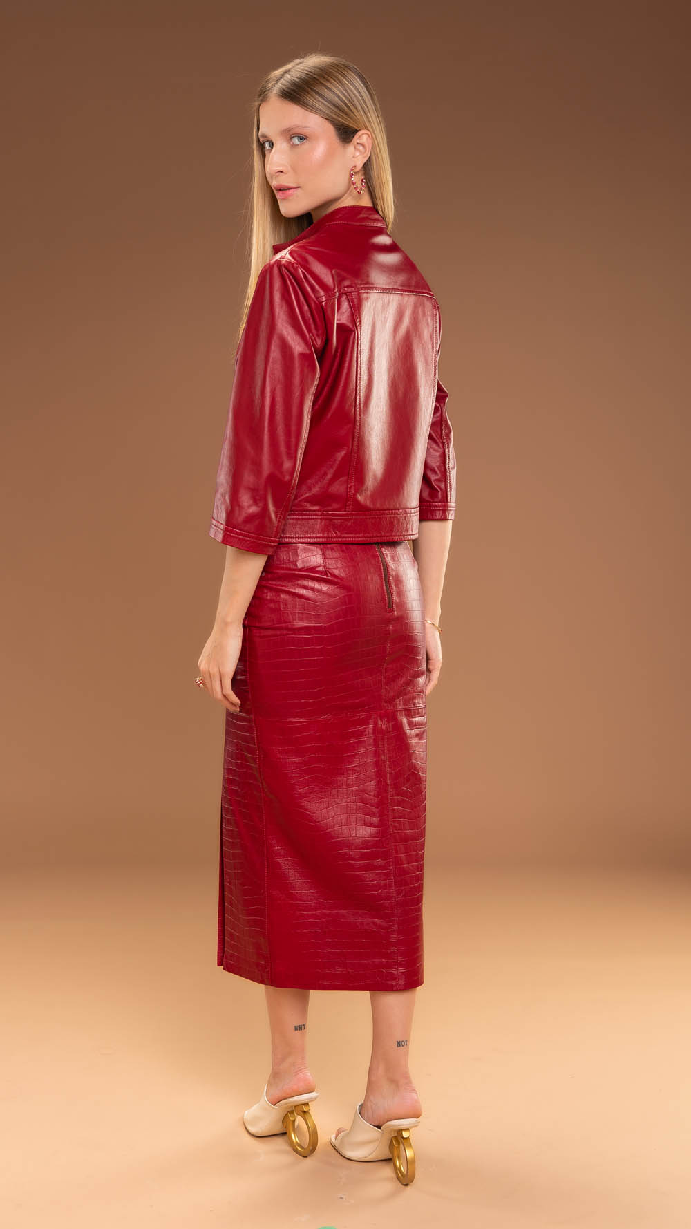 A saia lápis 100% Couro caprino com textura de crocodilo é uma peça sofisticada e poderosa.