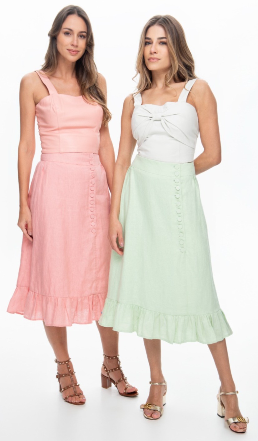 Confeccionada em linho leve e estruturado, essa saia é a combinação perfeita de charme e frescor. O detalhe dos botões frontais traz um toque clássico, enquanto o babado suave na barra adiciona movimento e feminilidade à peça.