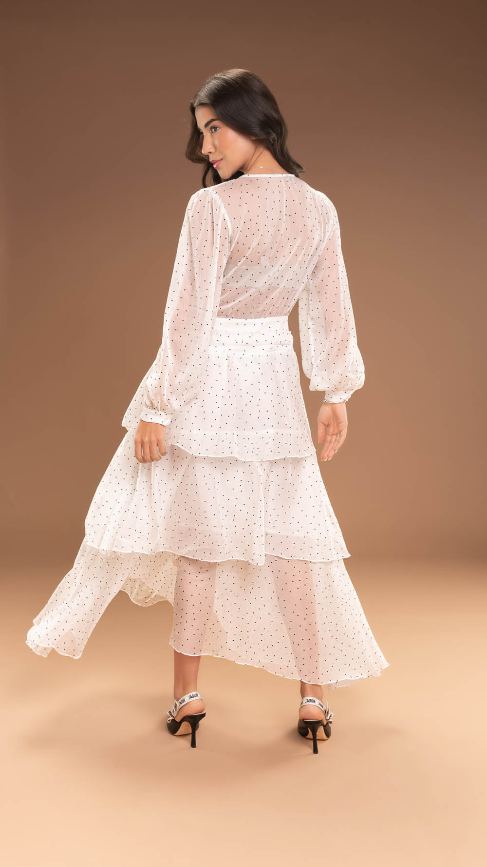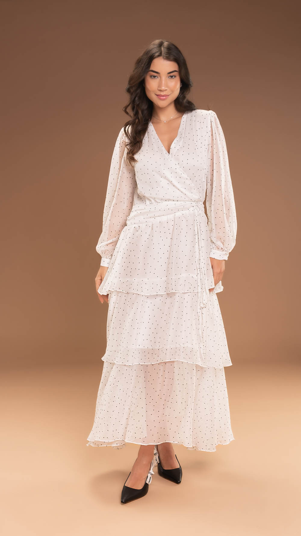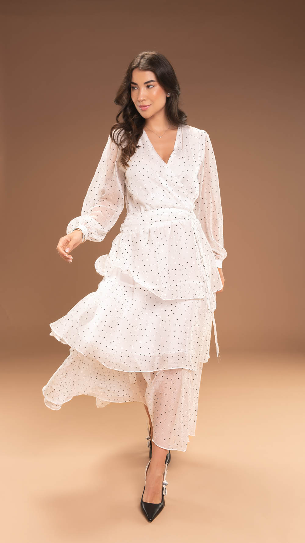 O vestido clássico poá possui mangas e comprimento longo, decote transpassado, fechamento em zíper na lateral, a marcação na cintura ele valoriza ainda mais a silhouetta da mulher, proporcionando um visual moderno e elegante. ♥