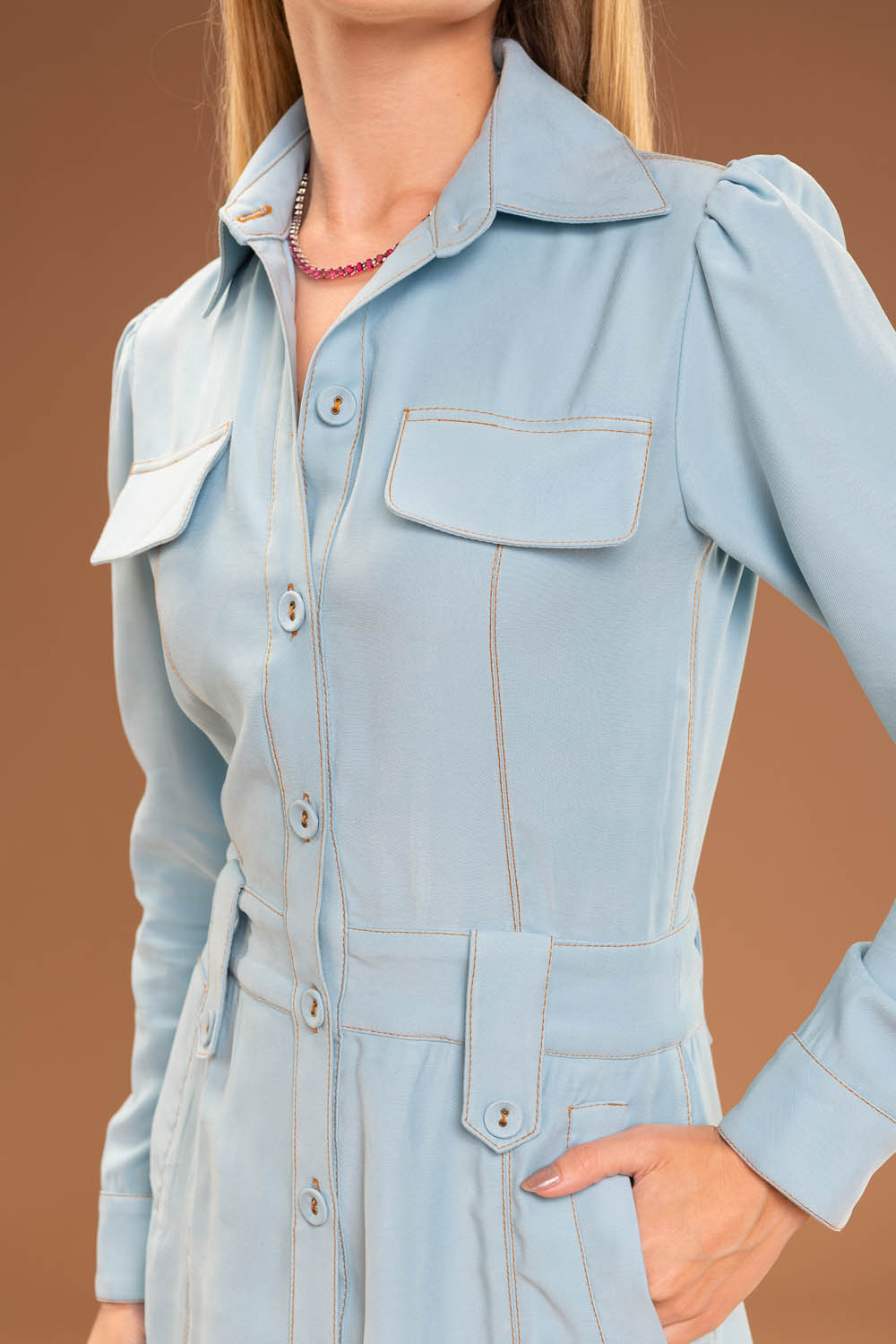 Chemise midi, manga longa, com bolsos laterais é a combinação perfeita de elegância e conforto.