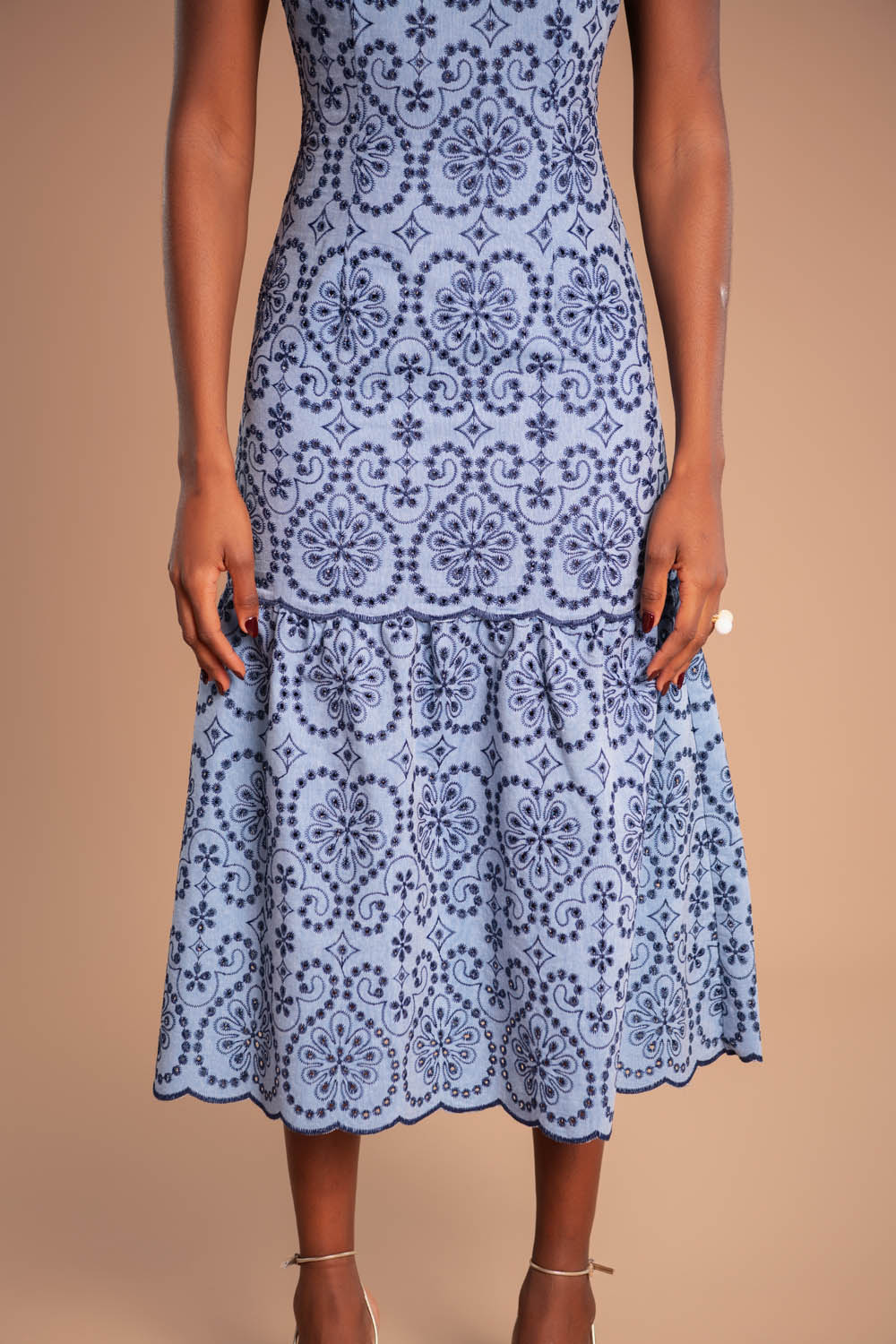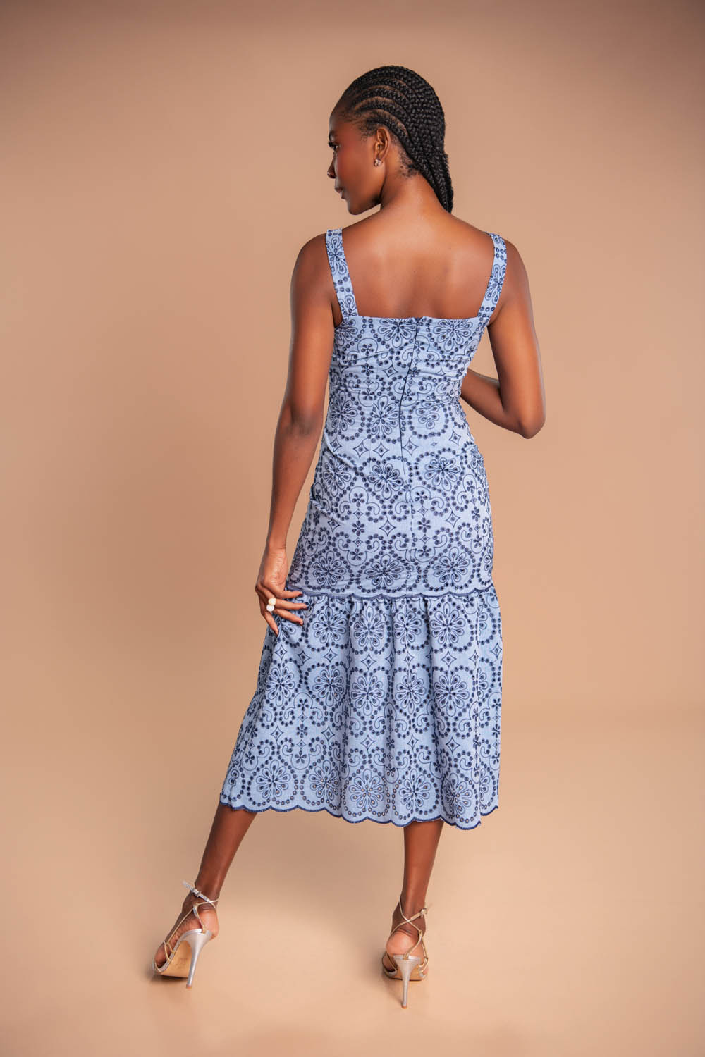 O vestido midi em renda richelieu bordado azul é uma peça encantadora que combina delicadeza e sofisticação. Com detalhes cuidadosamente trabalhados, ele destaca-se pelo recorte estratégico que valoriza a silhueta de forma elegante. A textura bordada traz um toque artesanal e refinado, tornando-o perfeito para ocasiões especiais ou eventos que pedem um look marcante e feminino.